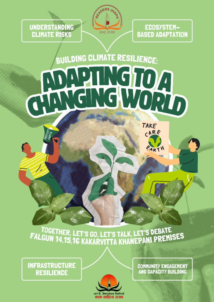 After the 4th Art and Literature Festival the subsequent editions were halted due to the aftermath of the Covid 19 after 2020. With lives coming back on track, it was decided to resume the Festival series, this time on a theme of the pressing issue affecting the globe rapidly: The Climate Change, the effect of which has been visible more than before in recent years. To lay a groundwork to this Readers Jhapa started a series dedicated to the issue of Climate Change from April 2024 where the members of Readers Jhapa made presentations analyzing the articles ranging from the history of Climate Change to the modern day adaptation plans to tackle its effects. This series has helped us to think of the adaptation plans which can be implemented locally to tackle the difficulties faced due to Climate Change in our region. Writers, scholars and ground workers working in this field were also invited in this series to present their works and findings to the audiences of our area. The 5th Edition of the Art and Literature Festival is proposed to be the culmination of the Environment Series where, like in the past, the writers, the scholars, the ground workers, the policy makers, the artists, the educationists,the entrepreneurs, the agriculturalists and the other stakeholders from Nepal and India in the field of Environment will gather to share their findings, their sufferings and their proposed plan to mitigate and adapt to the looming threat of the Climate Change.